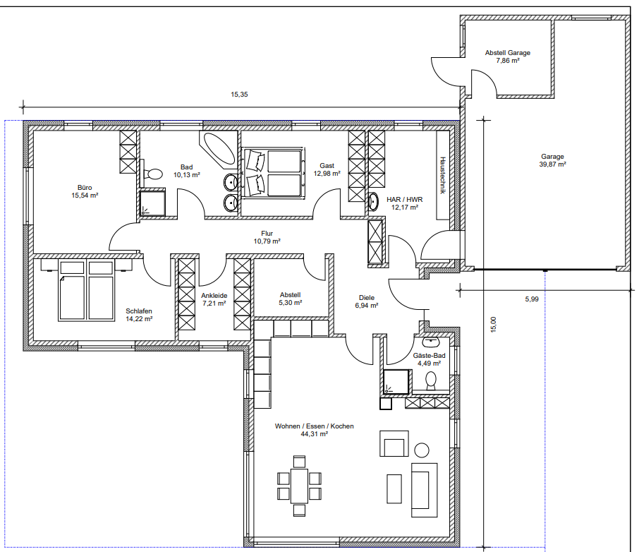 Der Preis für diesen Bungalow mit knapp 150 m² und Platz für Schlafzimmer, Arbeits- und Gästezimmer, den wir für Sie individuell als Architektenhaus im Energieeffizienz-Haus Standard bauen, beginnt ab 385.000 €.