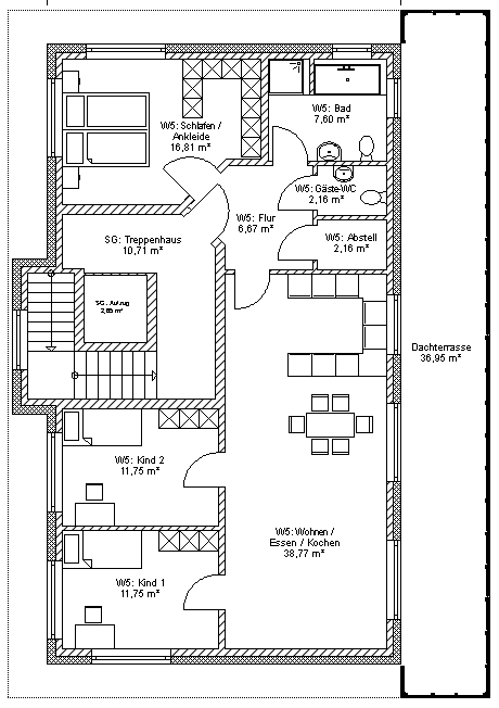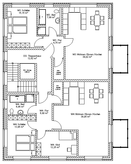 Der abgebildete Mehrfamilienhaus Grundriss wird selbstverständlich im Rahmen unserer Planungsleistung an Ihre Bedürfnisse / Grundstücksvorgaben angepasst. Die Mehrfamilienhaus Kosten variieren entsprechend der Grundrisse und der Ausstattung der 5 Wohnungen.