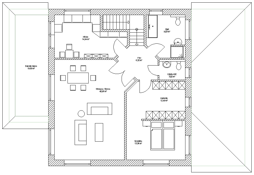 Der abgebildete Mehrgenerationenhaus-Grundriss wird selbstverständlich im Rahmen unserer Planungsleistung an Ihre Bedürfnisse / Grundstücksvorgaben angepasst.